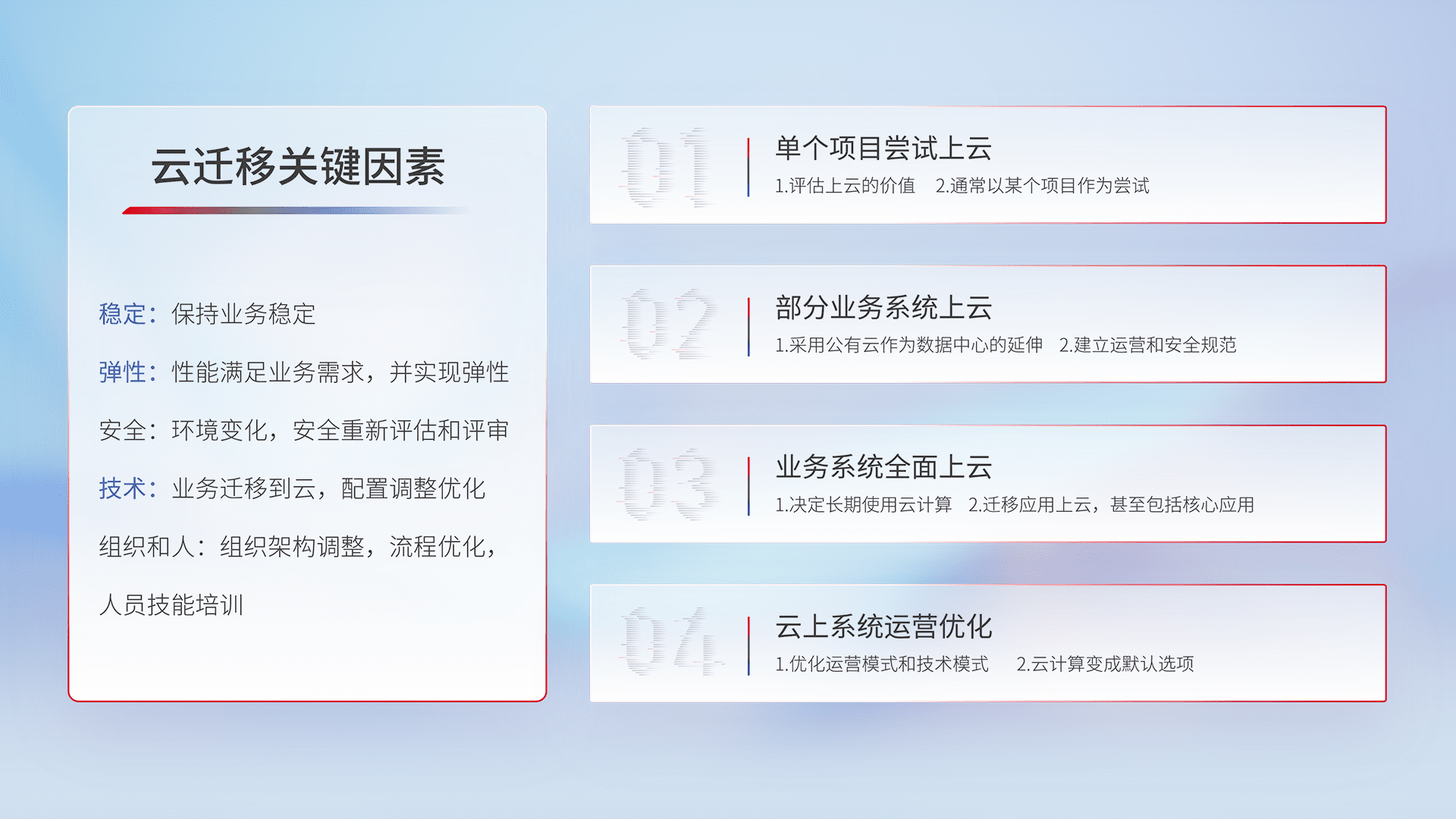 结合实际业务,,,,从规划设计、、、、云平台选型、、、云原生改造、、、数据迁移、、、、集成交付,,迁移全过程为客户识别最佳上云路径,,做好风险识别管理,,,,设计网络架构、、、、身份权限、、、安全审计合规、、操作审计、、、日志审计、、、监控告警策略、、、多站点容灾设计等,,,,对云上基础设施进行整体规划,,提升IT治理水平,,,以满足弹性、、、、高可用、、、、高性能的需求。。